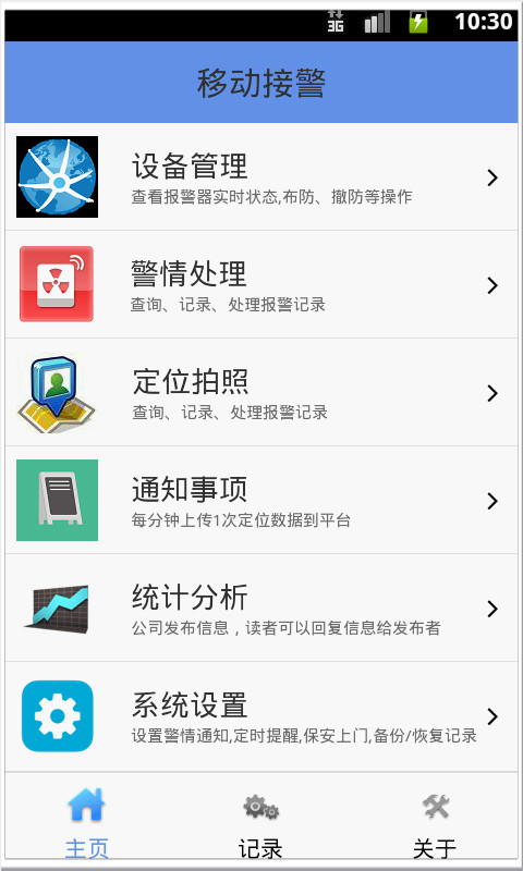 客戶:定制接收自己設備的警情信息,自動標記每條信息未查看或已查看;和平臺聯動處理的可以發信息給對應保安,指示如何處理警情。