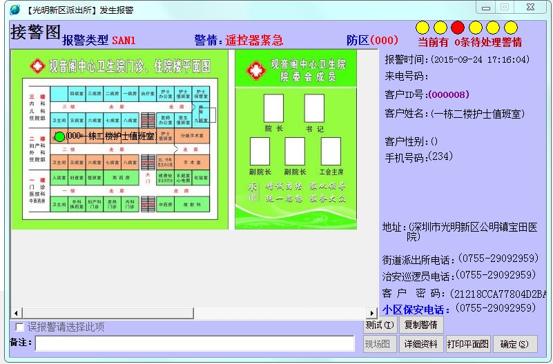4.完整的用戶資料信息:報警用戶的名稱、地址、電子地圖/平面圖、視頻圖、負責人、緊急聯系人、聯系電話、所在地分局、派出所以及報警時間、報警位置、報警次數、客戶布撤防狀態、客戶設備工作是否正常等信息。