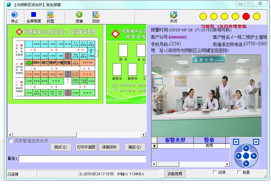 此主機優勢是可連接醫院原有的攝像機,與緊急按鈕配套實現緊急報警。一旦有警情,管理中心可立刻看到現場視頻,哪個地方報警,彈出哪個地方的視頻圖像,同時視頻可作為報警后的證據保存起來,警務室的工作人員可通過視頻確認是否誤報。
